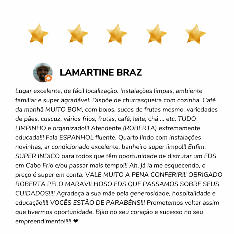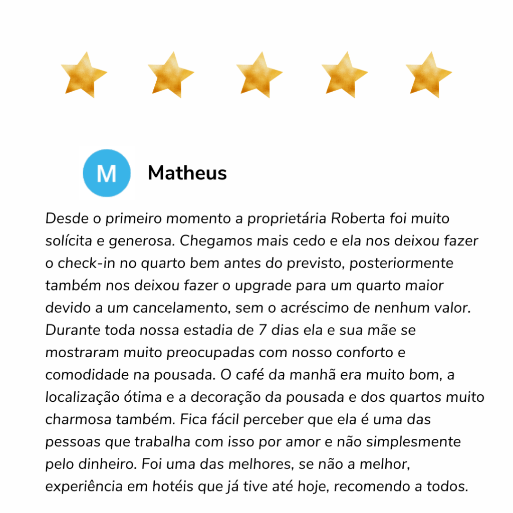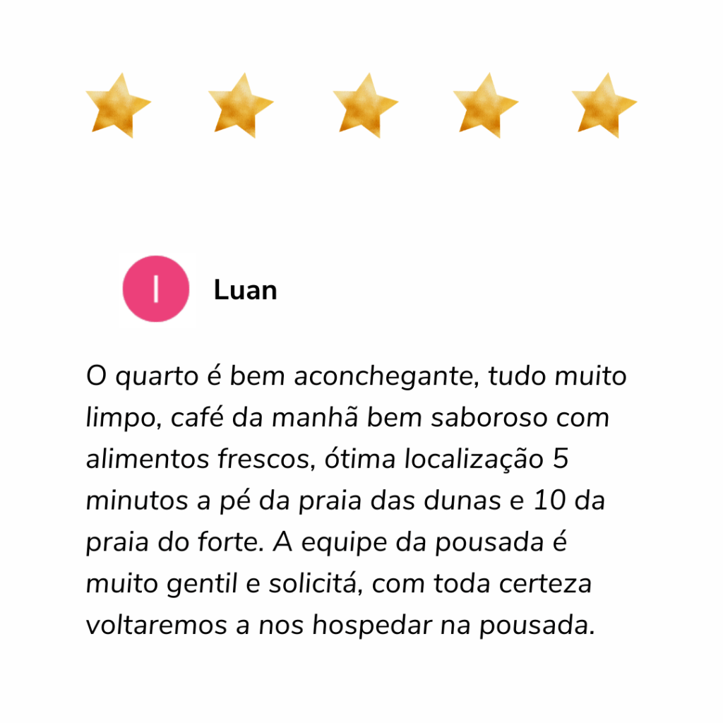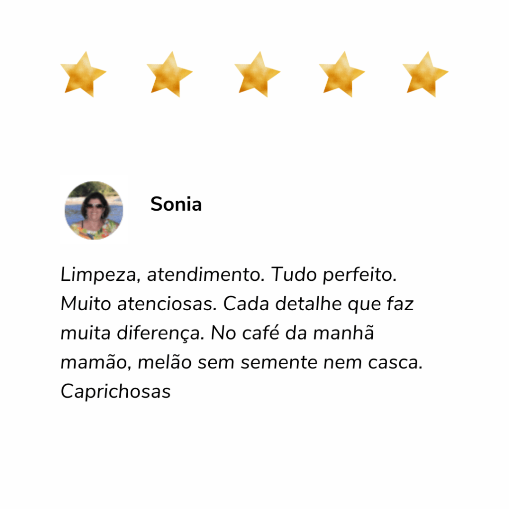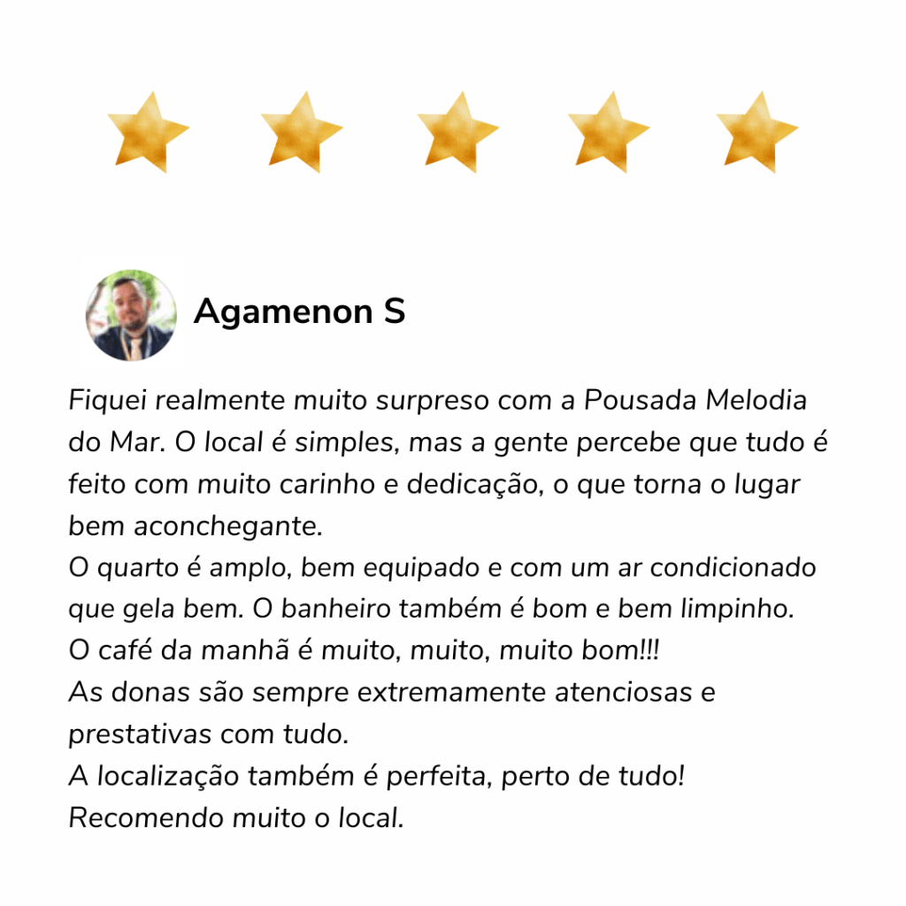 A Pousada Melodia do Mar é muito bem avaliada nos principais canais, com notas de destaque no Booking.com e TripAdvisor e Google. Veja um pouco dos comentários de nossos queridos hóspedes.