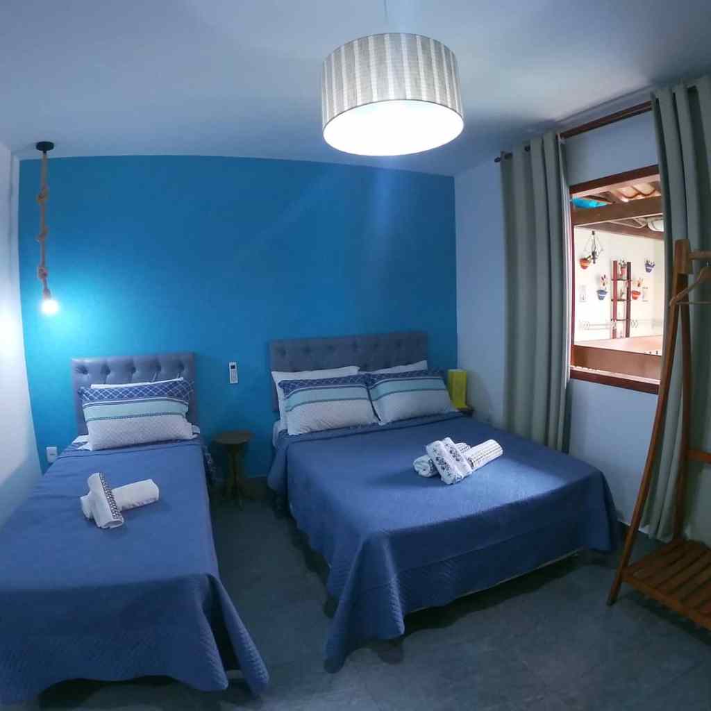 Suíte com cama de casal e uma cama de solteiro, ideal para família.